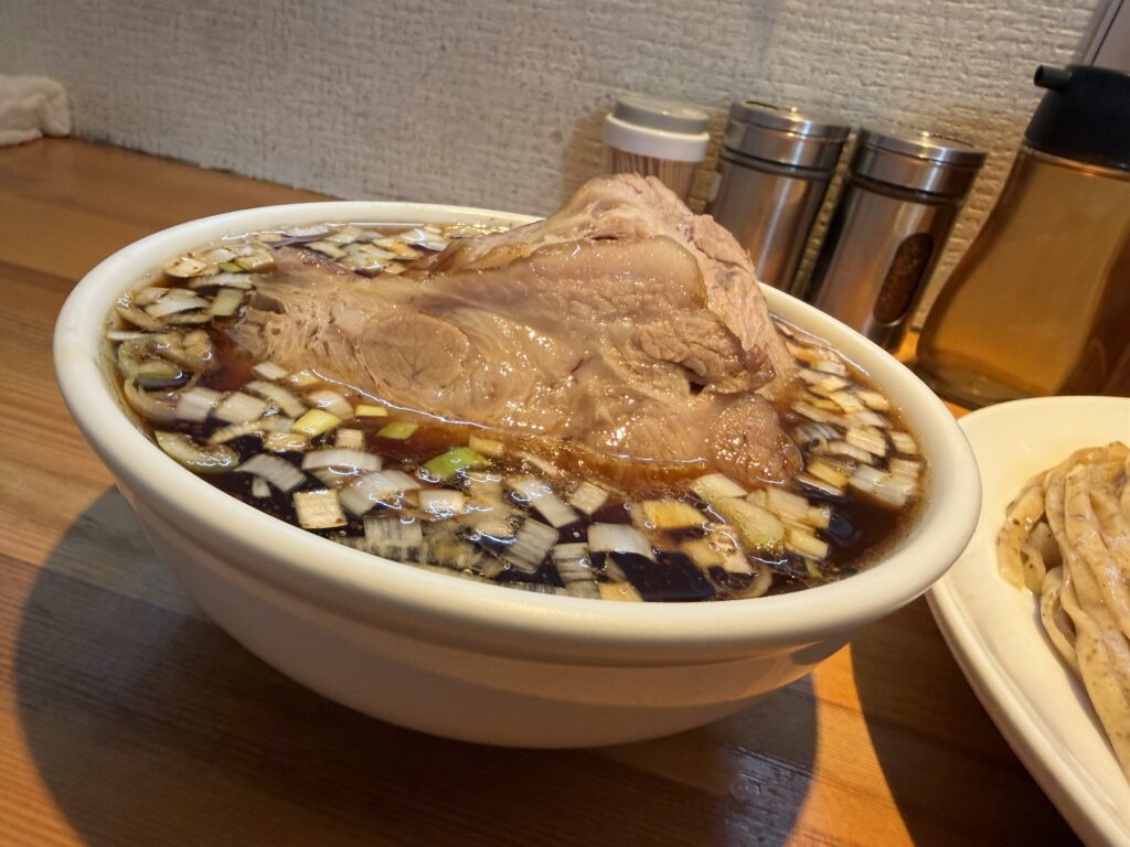 厚いチャーシューと煮卵が入ったつけ汁は並々溢れていました。シンプルな醤油味であっさりしていました!スープはキレがあってほんのり甘さもあり、麺との相性も抜群👍