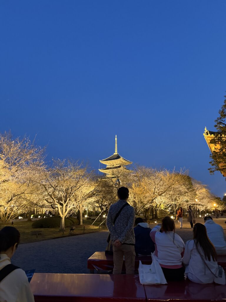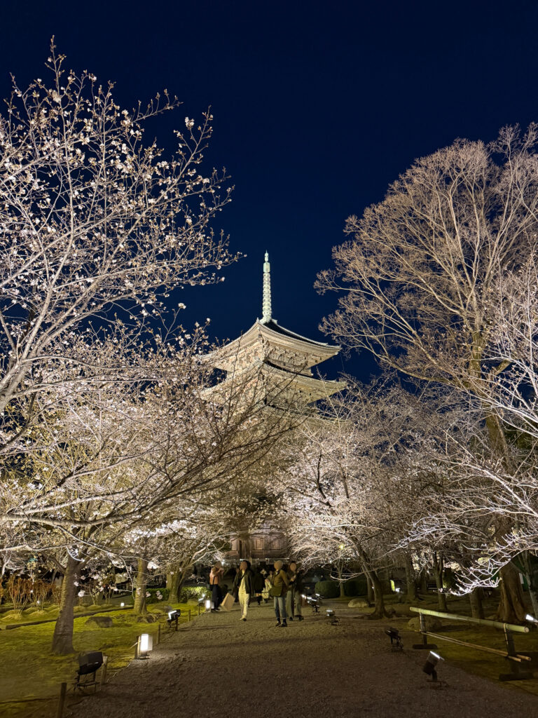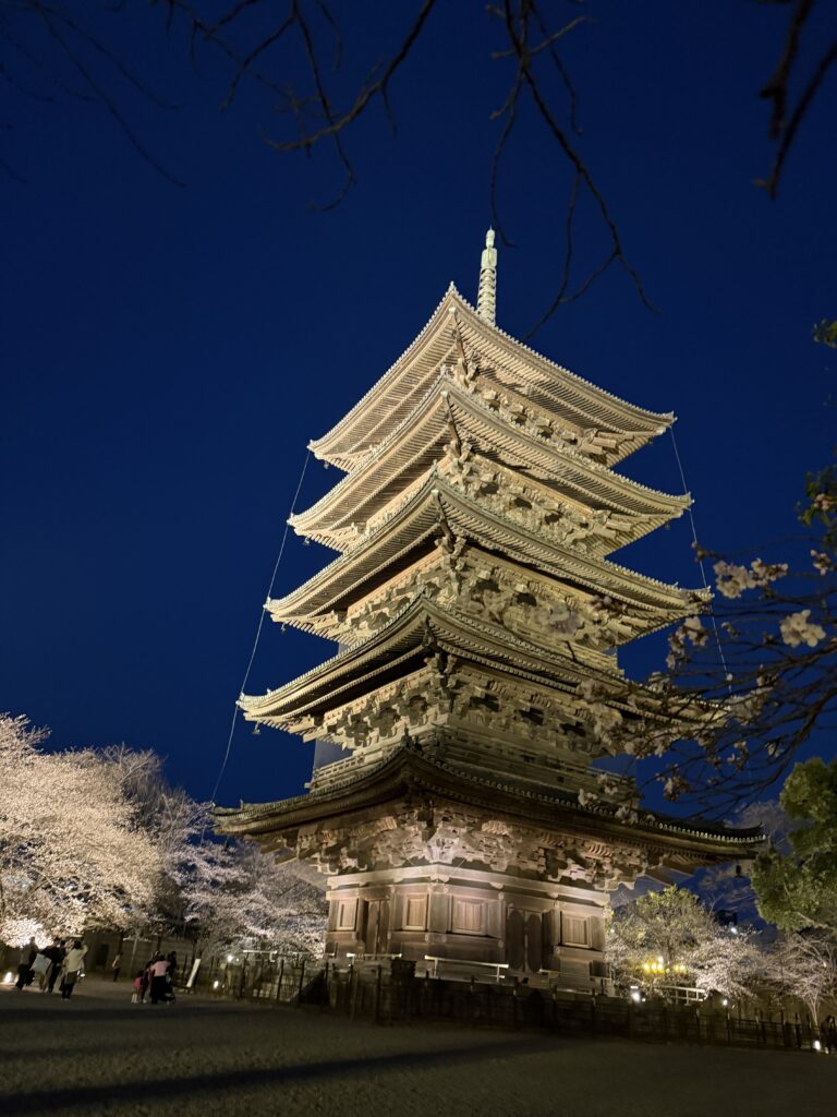 今回訪れたのは、京都を代表する名所のひとつ東寺の夜桜ライトアップです。