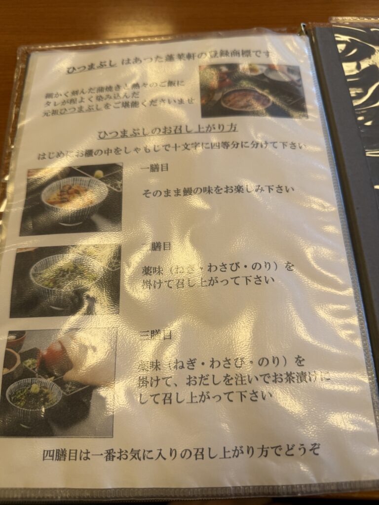 こちらのお店にはメニューにひつまぶしの食べ方が記載されていますので安心です。
